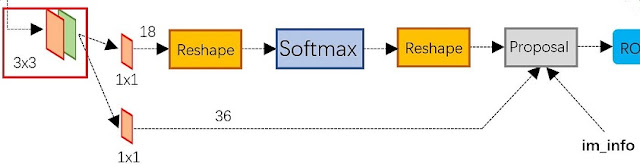 介紹完了anchors就可以正式進入RPN的介紹,RPN分為兩個部分: 第一部分(圖12上方部分)為分類層(box-classification layers),主要是透過softmax來分類anchors,將anchors分為positive和negative。