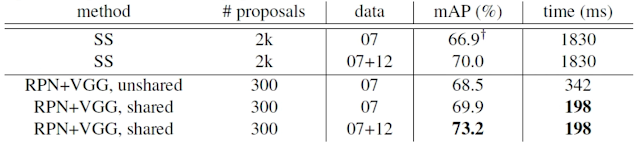 Faster R-CNN採用了RPN技術達到了73.2% mAP,執行速度相比於使用Selective Search的Fast R-CNN提升了約9倍。