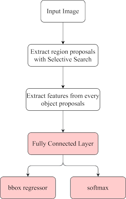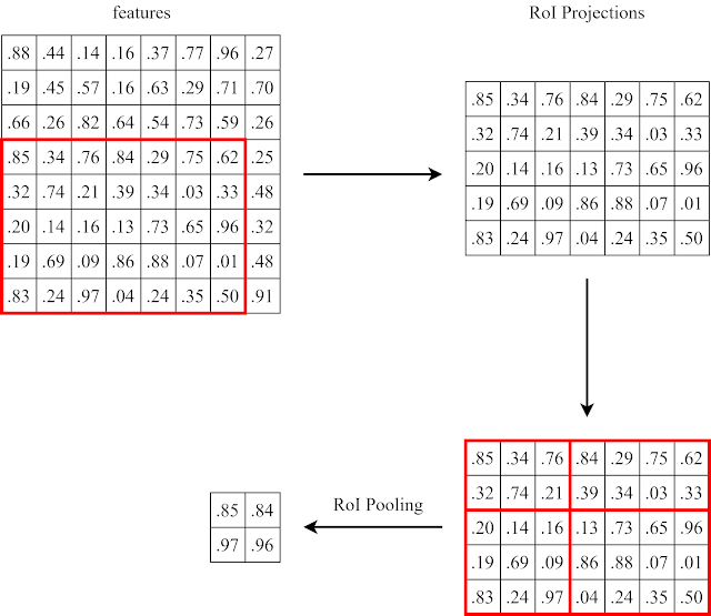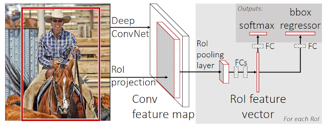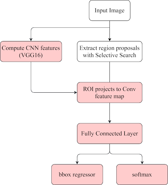 Selective Search從圖片提取出2000個候選框(Region Proposals),再將整張圖送入CNN模型進行特徵圖提取,然後將候選框透過RoI Projection投射到特徵圖上直接取得候選框對應的特徵圖,省去了將每個候選框送至CNN模型進行特徵提取的過程。