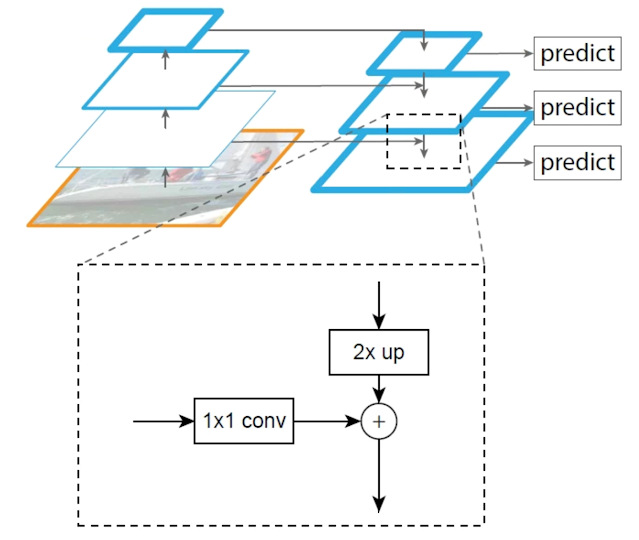 FPN [6](如圖19)簡單來說就是利用卷積過程中的特徵圖(features map)來對高維度的特徵圖進行upsampling。
