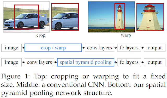 卷積層(Convolution)、池化層(pooling)、全連接層(Fully-Connected)的CNN模型中,模型的架構都是輸入圖經過縮放成固定大小的圖,然後再送入卷積層中計算出特徵圖,再將特徵圖送到全連接層,最後輸出分類結果(如下圖中上方的流程),而縮放/型變的過程多少都會損失圖像特徵;而SPP-Net的架構是在卷積層與全連接層間加入了SPP層,使得不固定大小的輸入圖可以在經過SPP層後擁有固定大小的特徵圖。